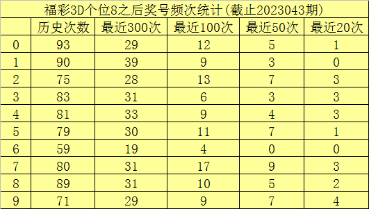 个位杀号:上期个位奖号为8,历史上个位奖号8共开出801次,最近100次个位奖号8出面前,其下期号码0-9开出次数区分为:奖号7开出17次,2开出13次,0开出12次,5开出11次,8开出10次,1、4、9开出9次,3开出6次,6开出4次。