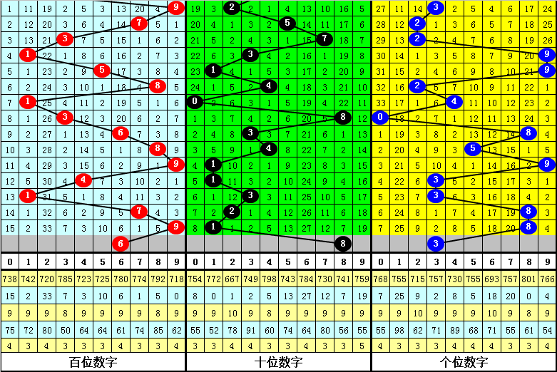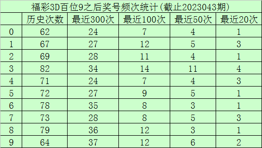 百位杀号:上期百位开出号码9,历史上百位号码9已开出718次了,最近100次百位号码9出现之后,其下期各号码频次区分为:号码3出现14次,1、8、9出现12次,2出现11次,5出现9次,6、7出现8次,0、4出现7次。