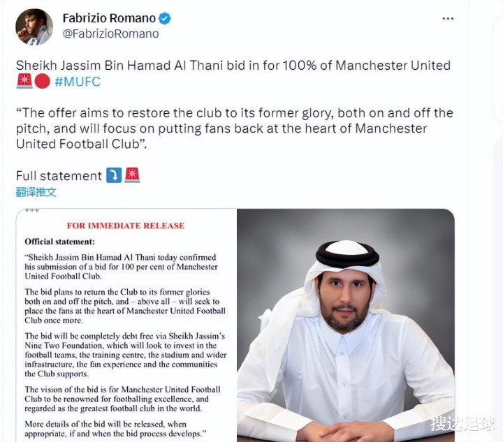 此前,卡塔尔银行主席之一的阿勒萨尼阐明在规模日照旧提交了收购曼联100%股份的报价。而拉特克利夫爵士以及他的英力士集团的报价仅仅收购曼联大宗股权。据了解,现年70岁的拉特克利夫爵士已聘任华尔街巨头摩根大通和高盛为其竞标提供提倡。