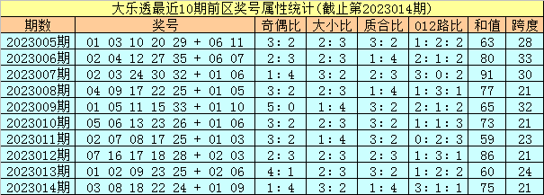 开奖总结:体彩大乐透第23014期开出奖号为:03 08 18 22 24+01 09,前区质合比为1:4,奇偶比为1:4,大小比为3:2,012路比为3:1:1,后区质合比为1:1,奇偶比为2:0,大小比为1:1,012路比为1:1:0。